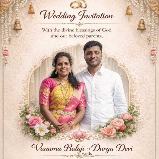 With the divine blessings of God and the loving guidance of our families, our lives united in a beautiful journey of togetherness. Vanumu Balaji and Durga Devi met through family introductions, where values, culture, and mutual respect formed the foundation of our bond.